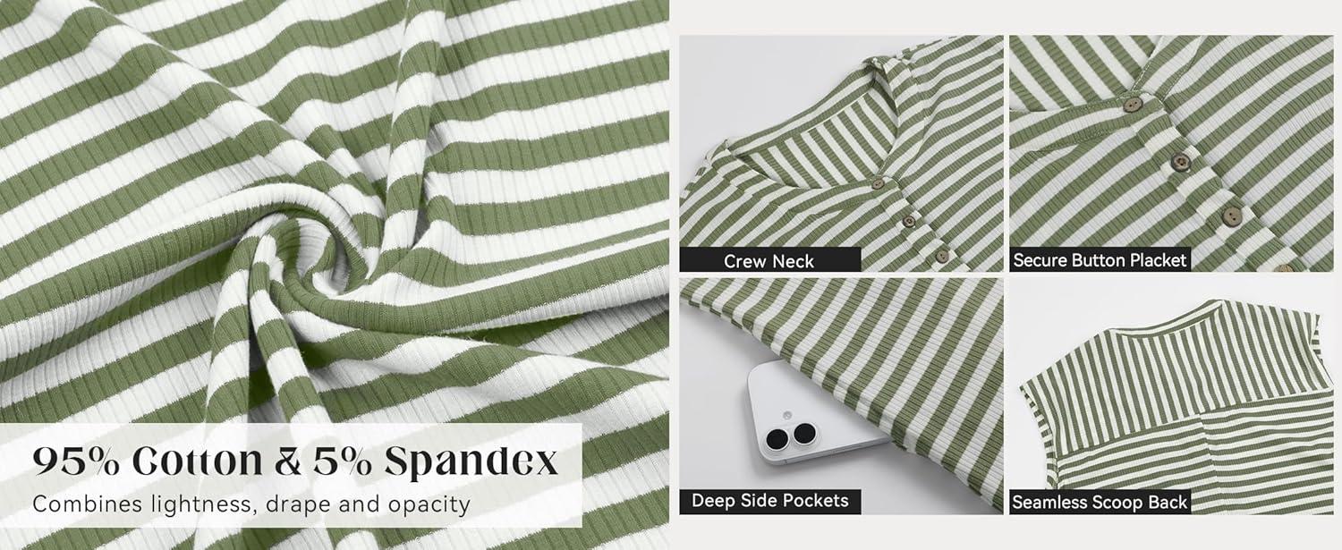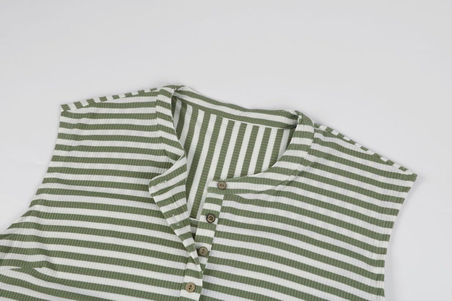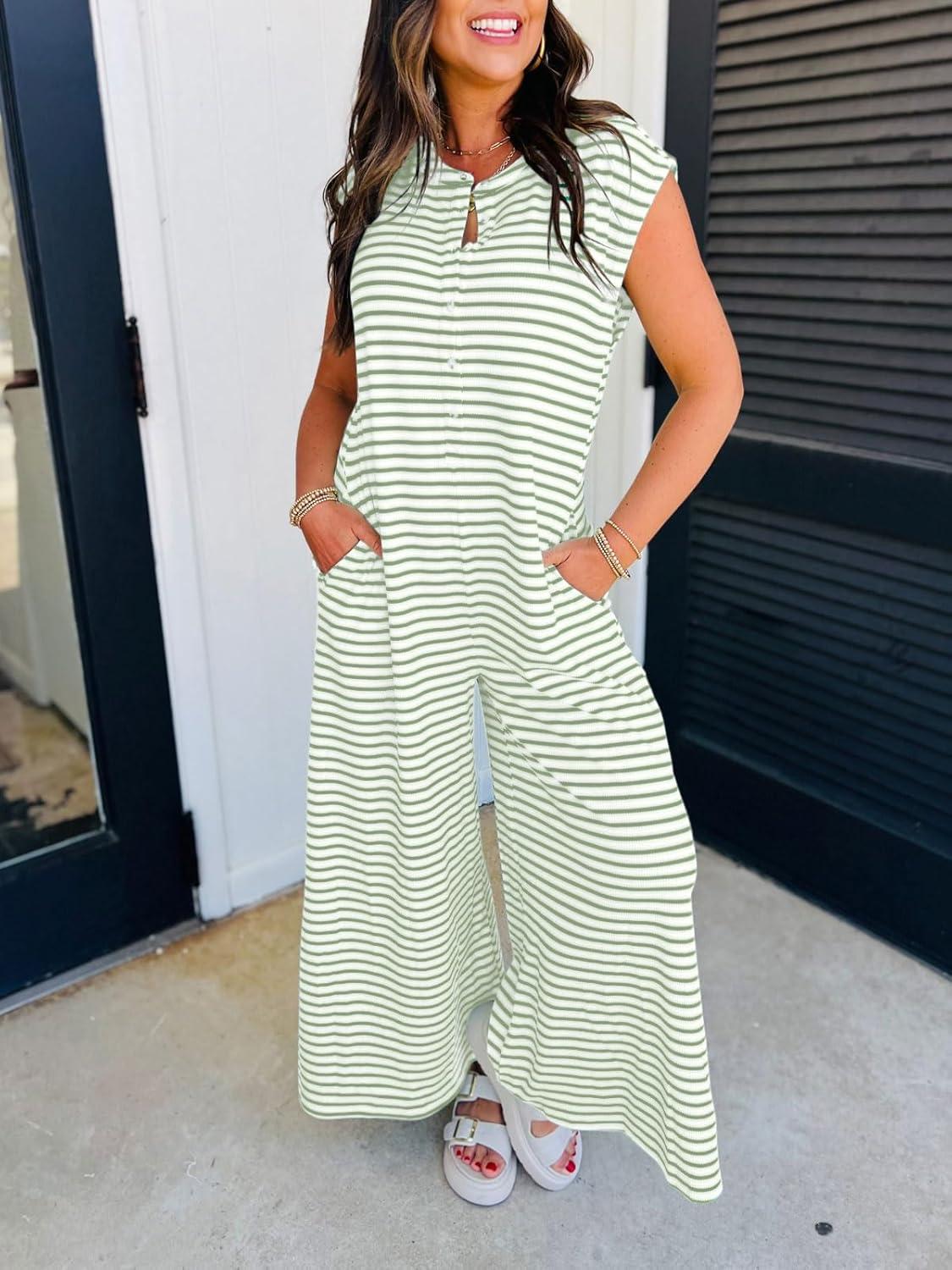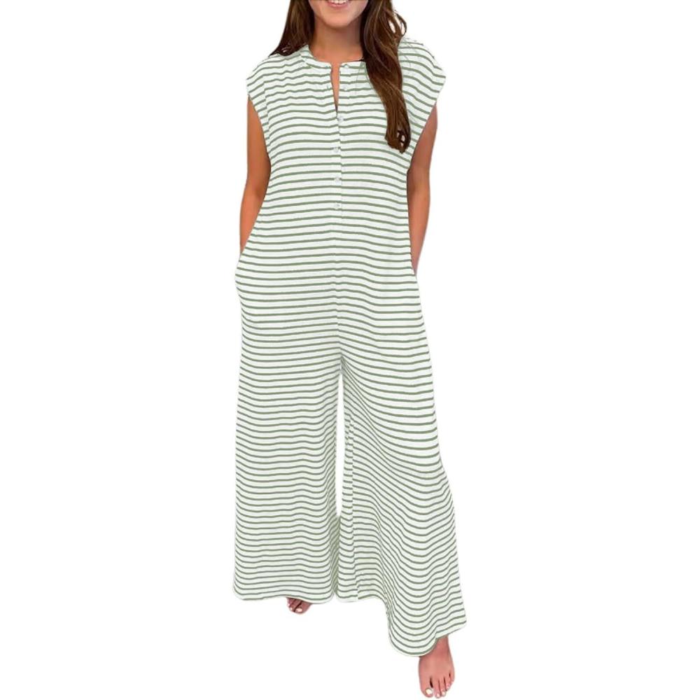 CHARTOU Women’s Summer Loose Stripes Overalls Cap Sleeve One Piece Jumpsuit Buttons Wide Leg Pants Romper(Green)