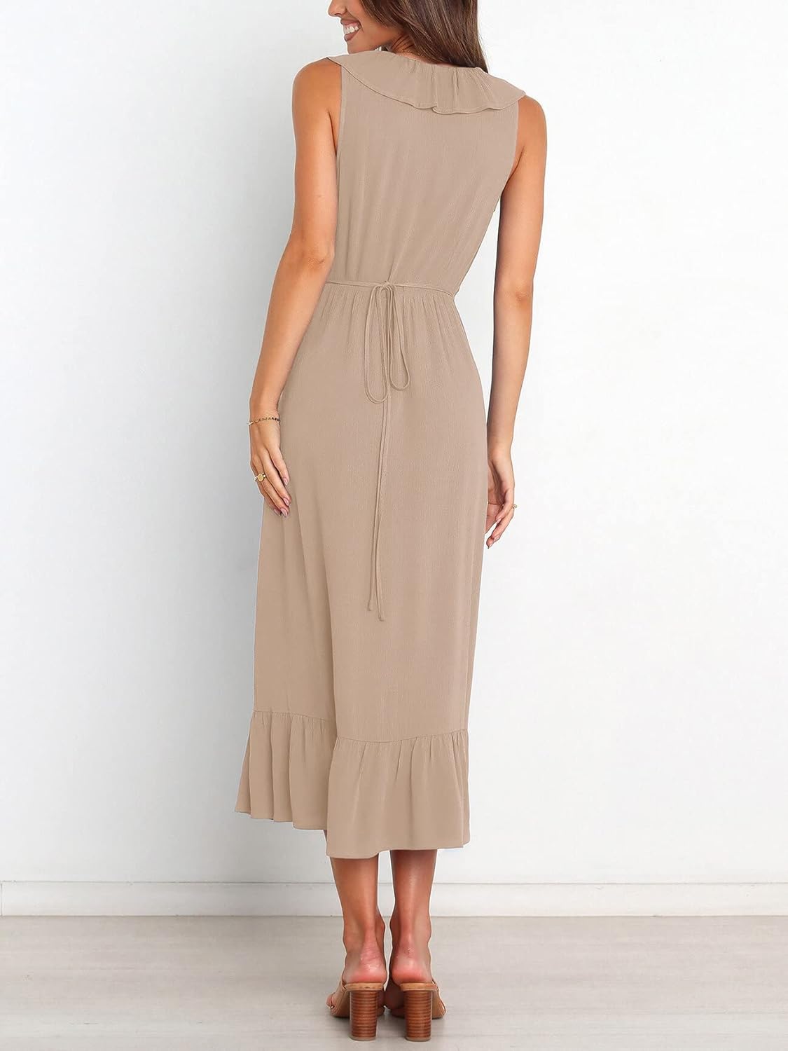 CHARTOU Women’s Summer Sleeveless Wrap V-Neck Ruffle Midi Long Dress(Apricot)