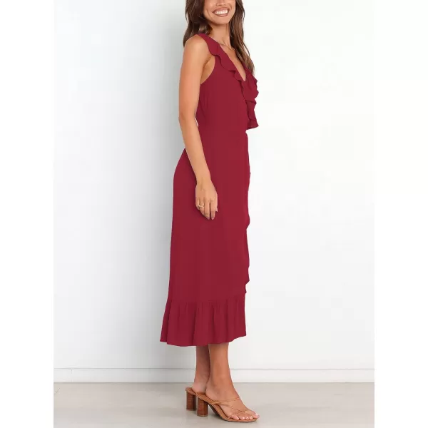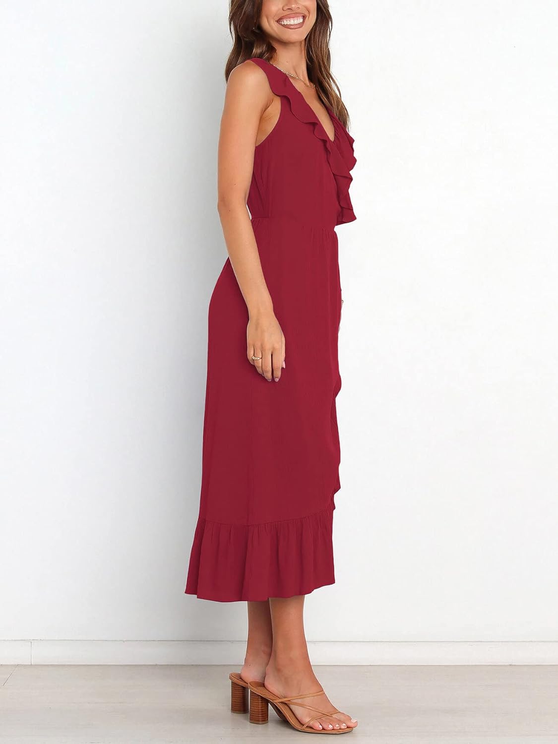 CHARTOU Women’s Summer Sleeveless Wrap V-Neck Ruffle Midi Long Dress(Red)