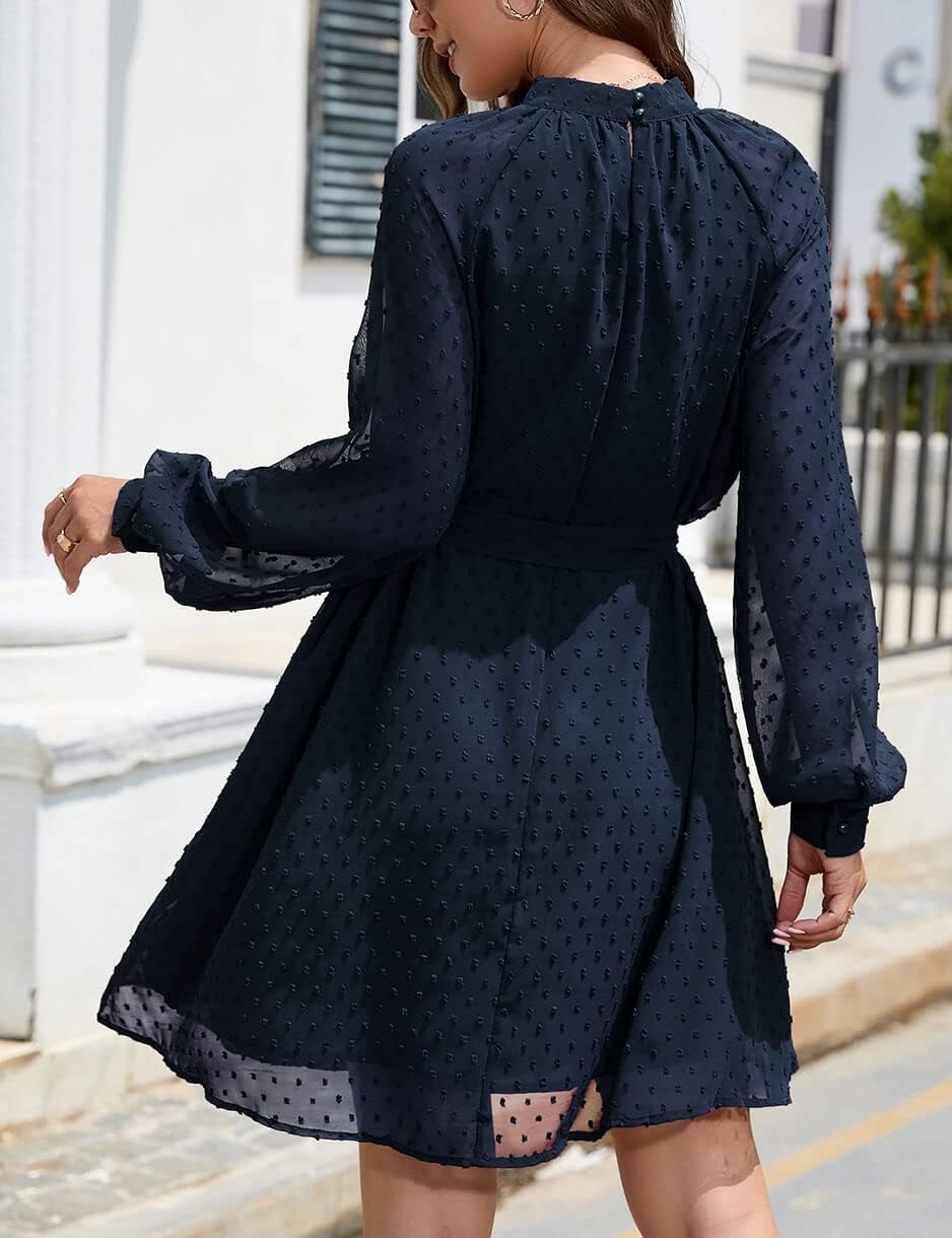 CHARTOU Women’s Swiss Dots Mock Neck Long Sleeve Tie Waist Midi Chiffon Dress(Navy Blue)