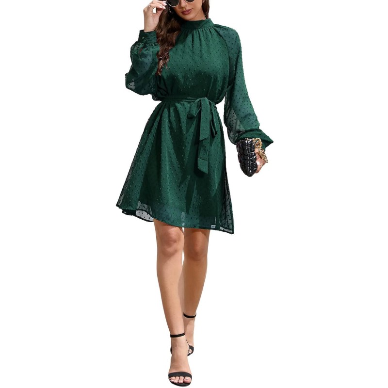 CHARTOU Women’s Swiss Dots Mock Neck Long Sleeve Tie Waist Midi Chiffon Dress(Olive)