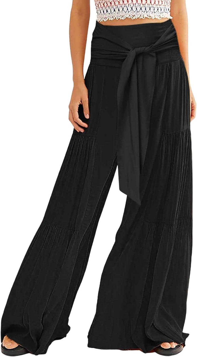 CHARTOU Women's Tie Knot High Waist Wide Leg Lounge Pants Tiered Beach Flowy Flare Pants Palazzo