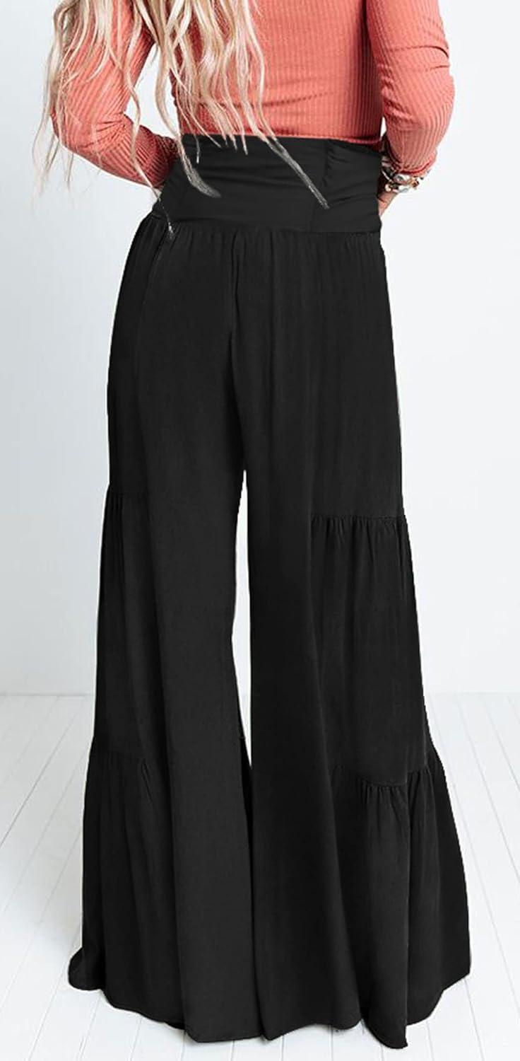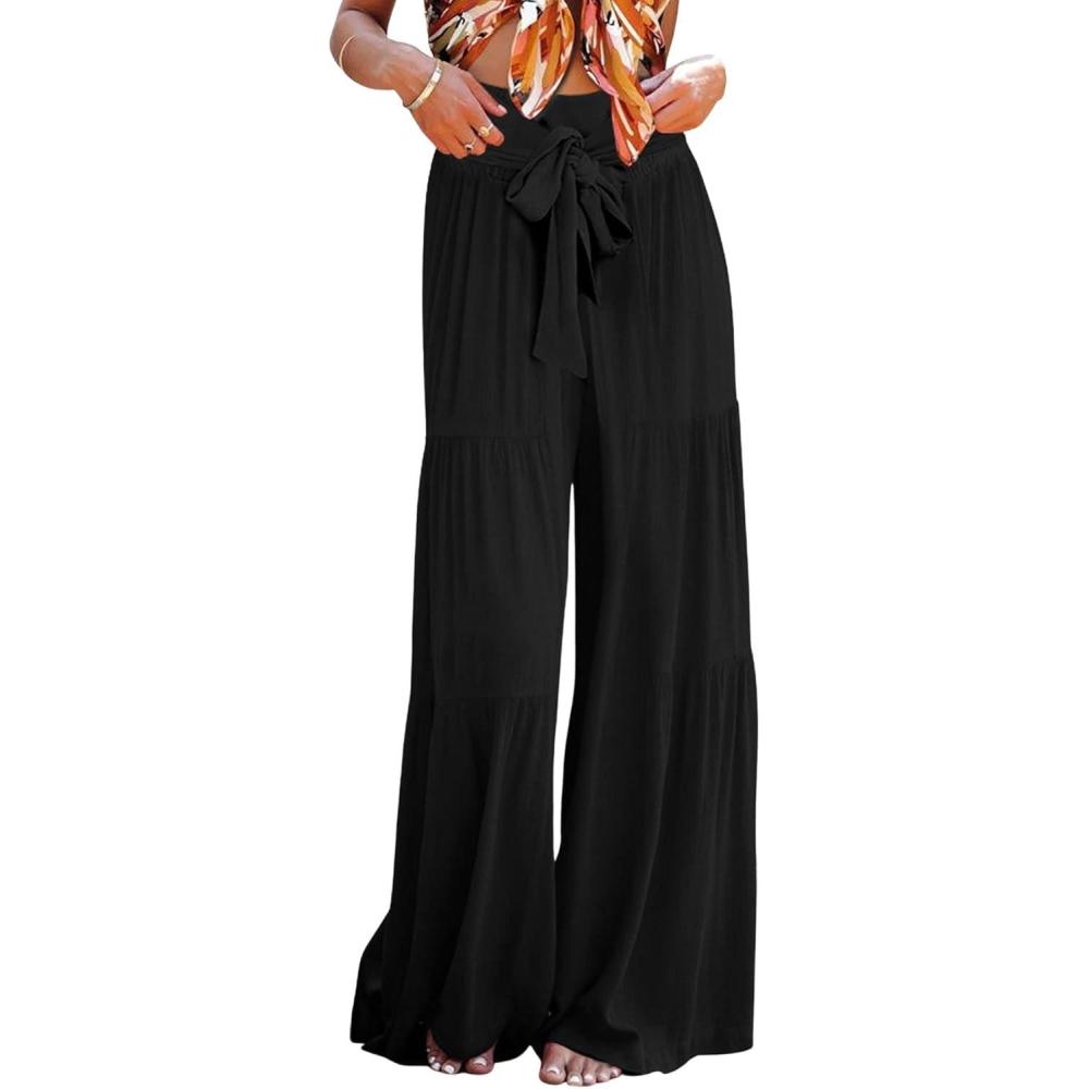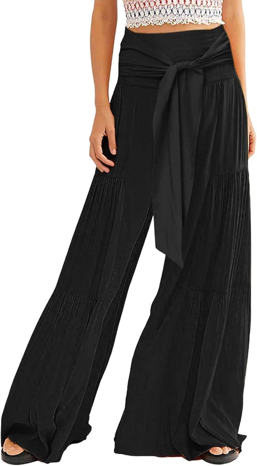 CHARTOU Women’s Tie Knot High Waist Wide Leg Lounge Pants Tiered Beach Flowy Flare Pants Palazzo(Black)