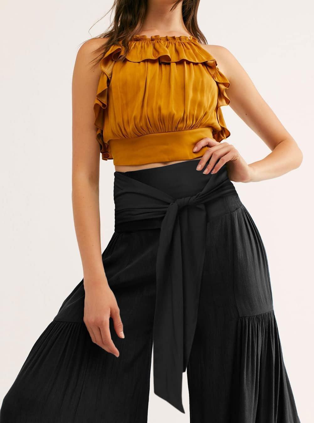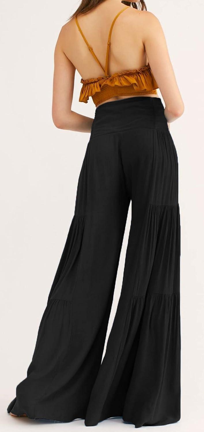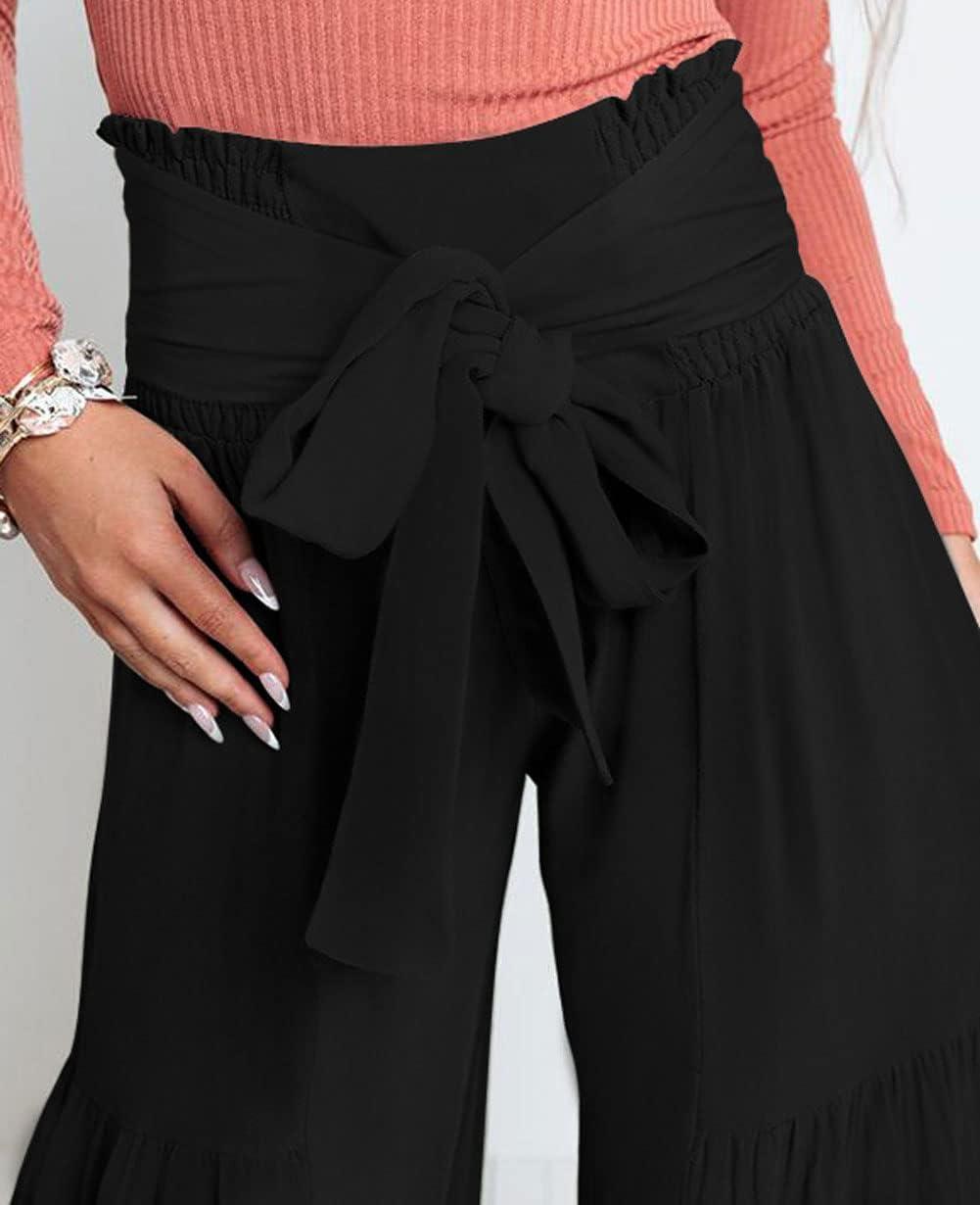 CHARTOU Women’s Tie Knot High Waist Wide Leg Lounge Pants Tiered Beach Flowy Flare Pants Palazzo(Black)