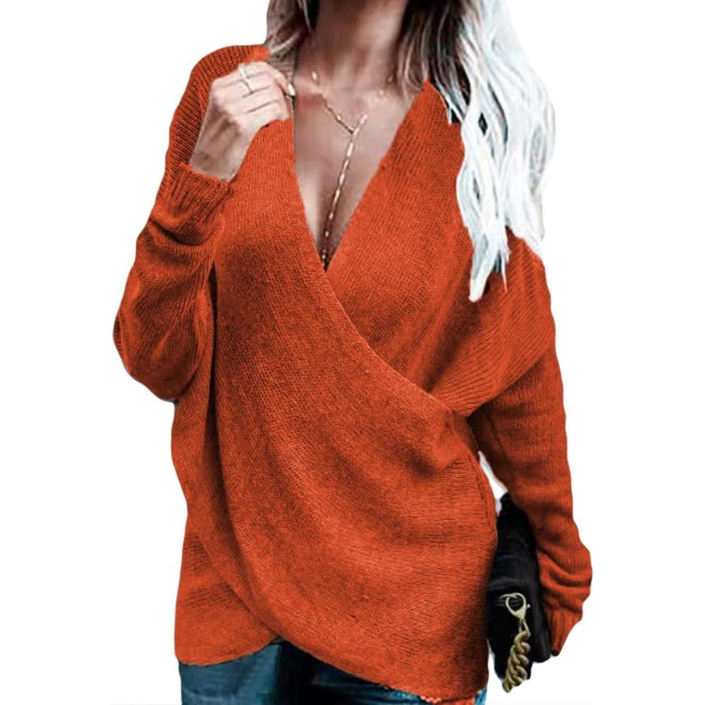 CHARTOU Women’s Trendy V Neck Crisscross Knitted Sweater Pullover Knitwear(Orange)