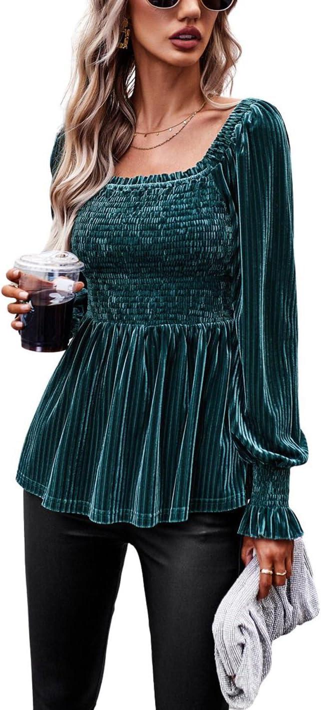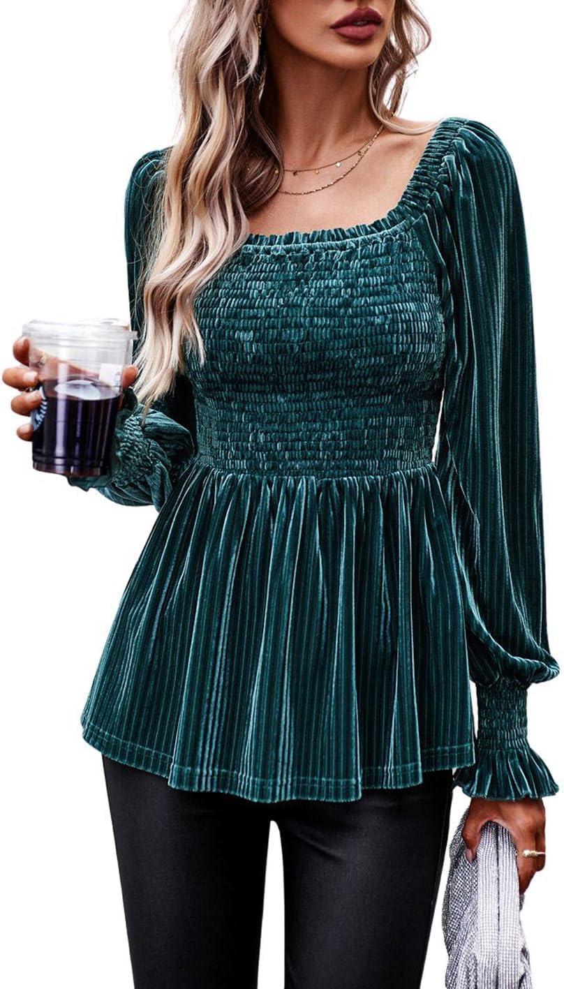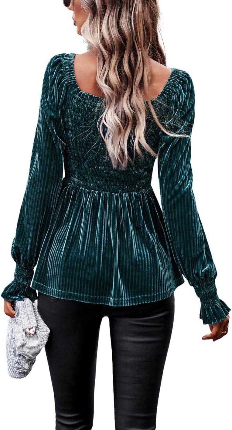 CHARTOU Women’s Velvet Ruched Square Neck Long Sleeve Smocked Peplum Blouse Shirt Tops(Green)