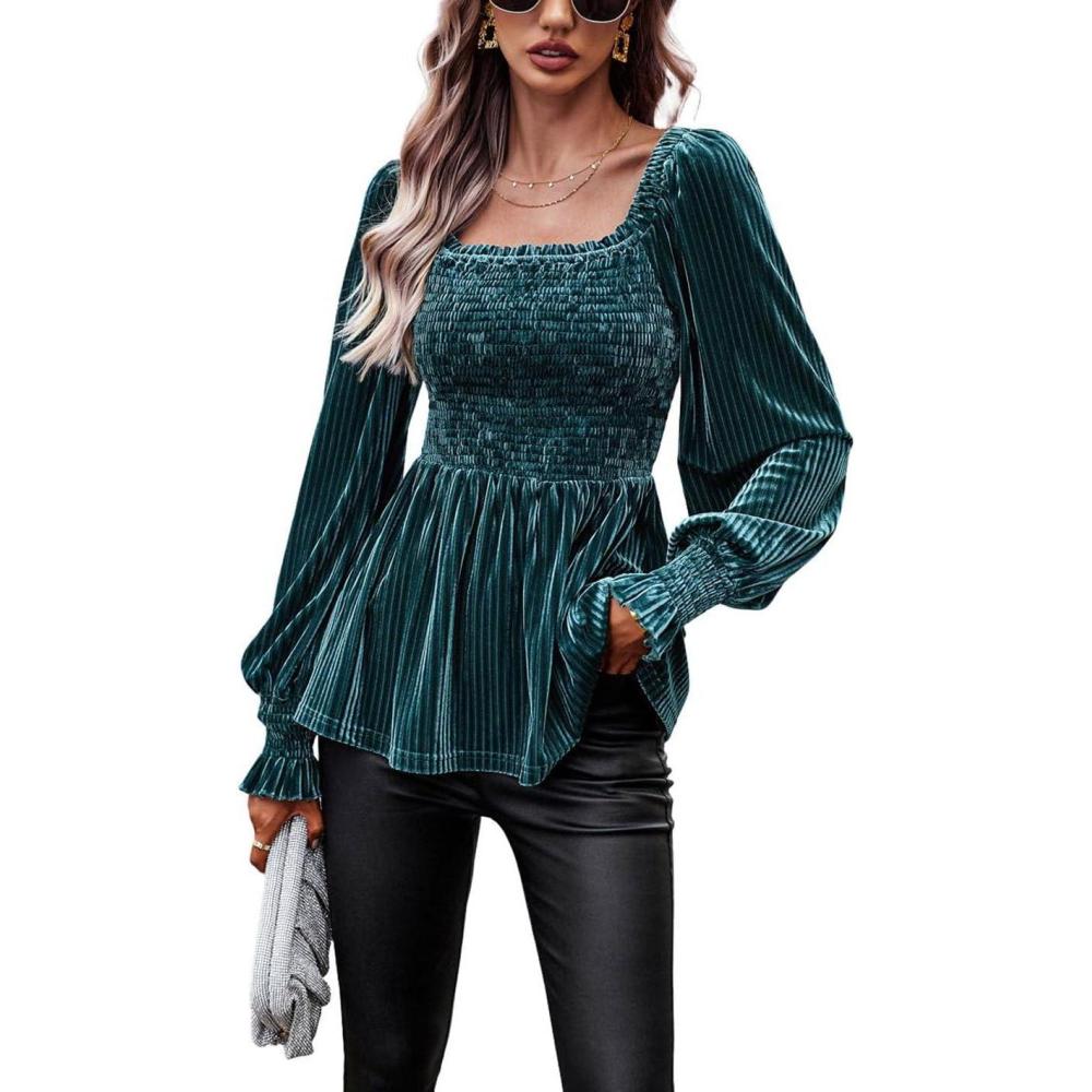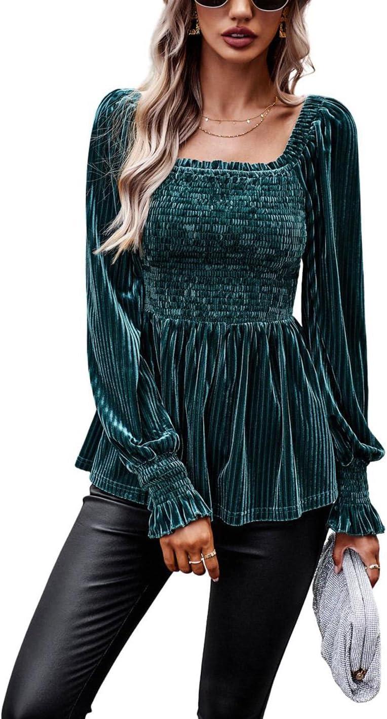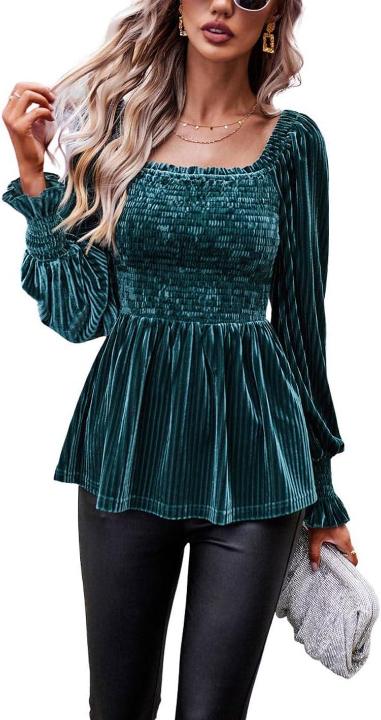 CHARTOU Women’s Velvet Ruched Square Neck Long Sleeve Smocked Peplum Blouse Shirt Tops(Green)