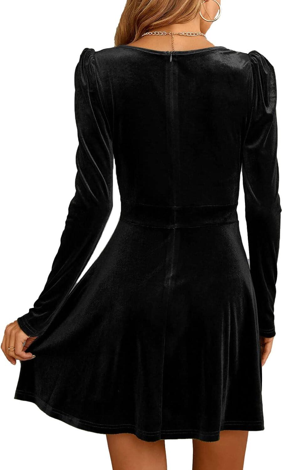 CHARTOU Women’s Velvet V-Neck Long Sleeve A-Line Cocktail Party Skater Dress(Black)
