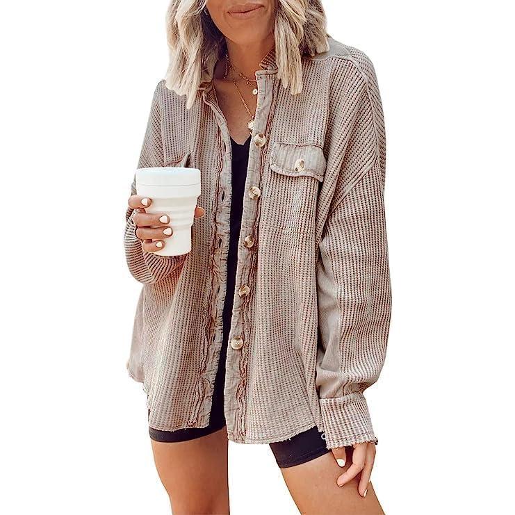 CHARTOU Women’s Vintage Banded Collar Button Down Baggy Loose Fit Mid-Weight Frayed Waffle Knit Shacket Shirt Tops(Khaki)