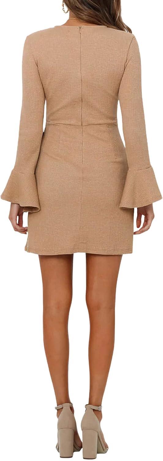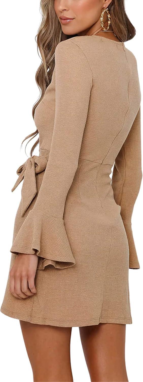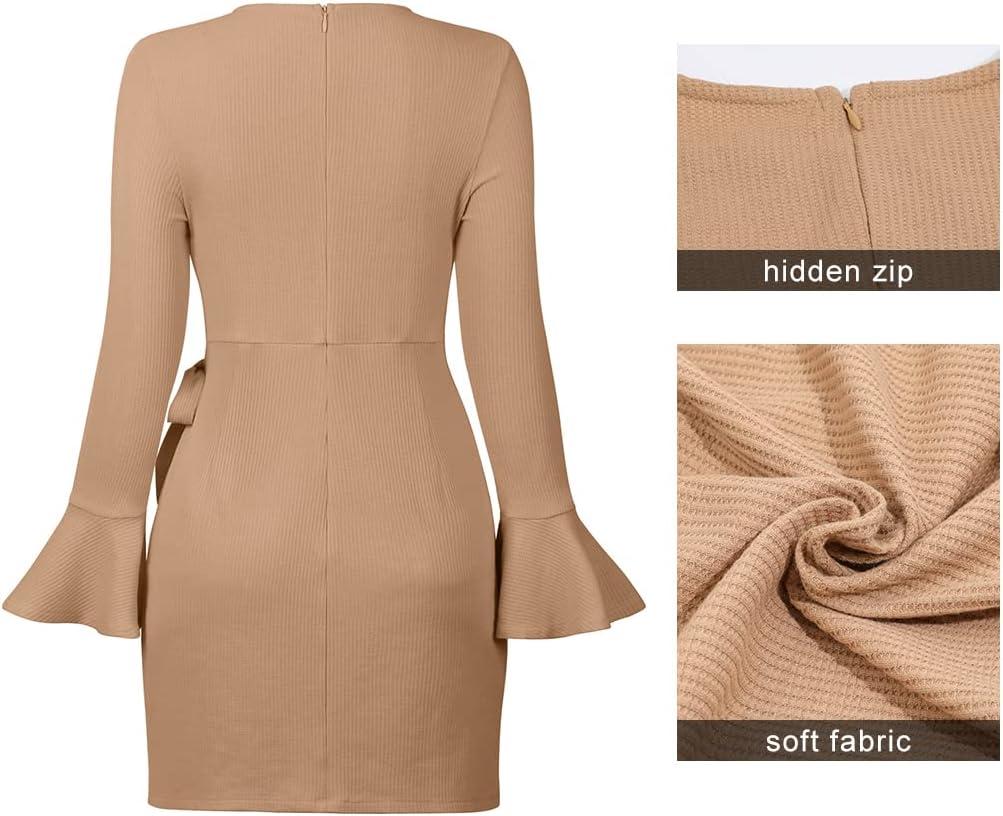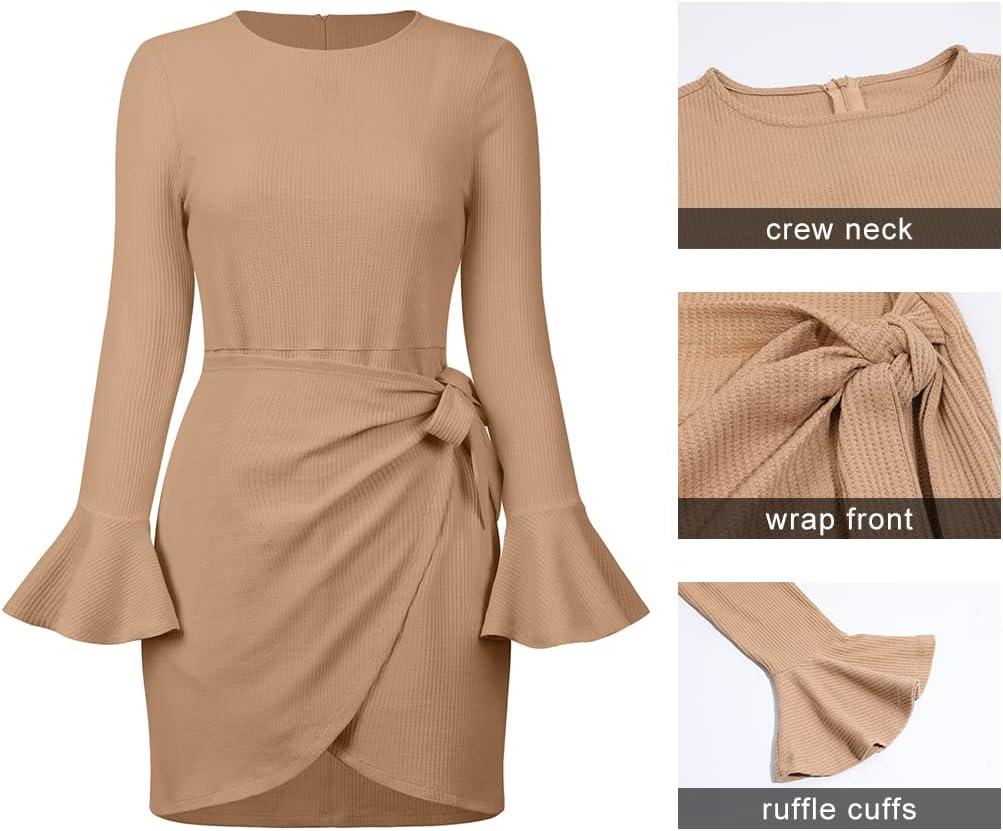 CHARTOU Women’s Waffle Knit Crewneck Long Sleeve Bodycon Mini Wrap Dress(Khaki)
