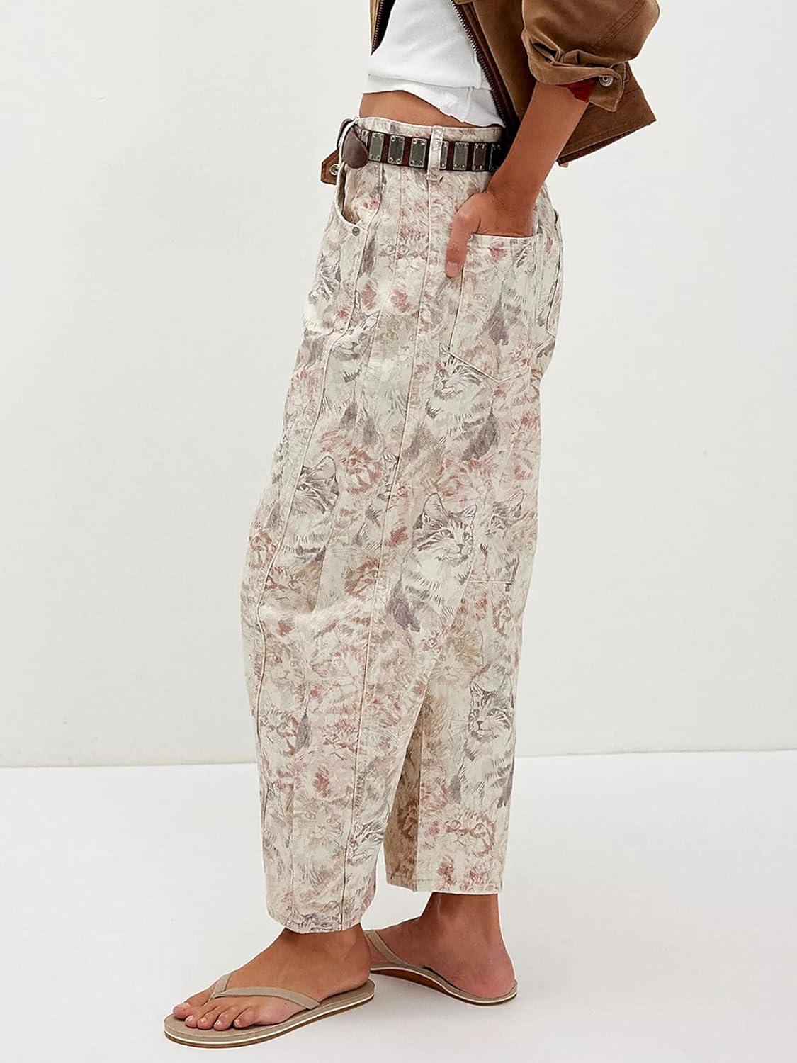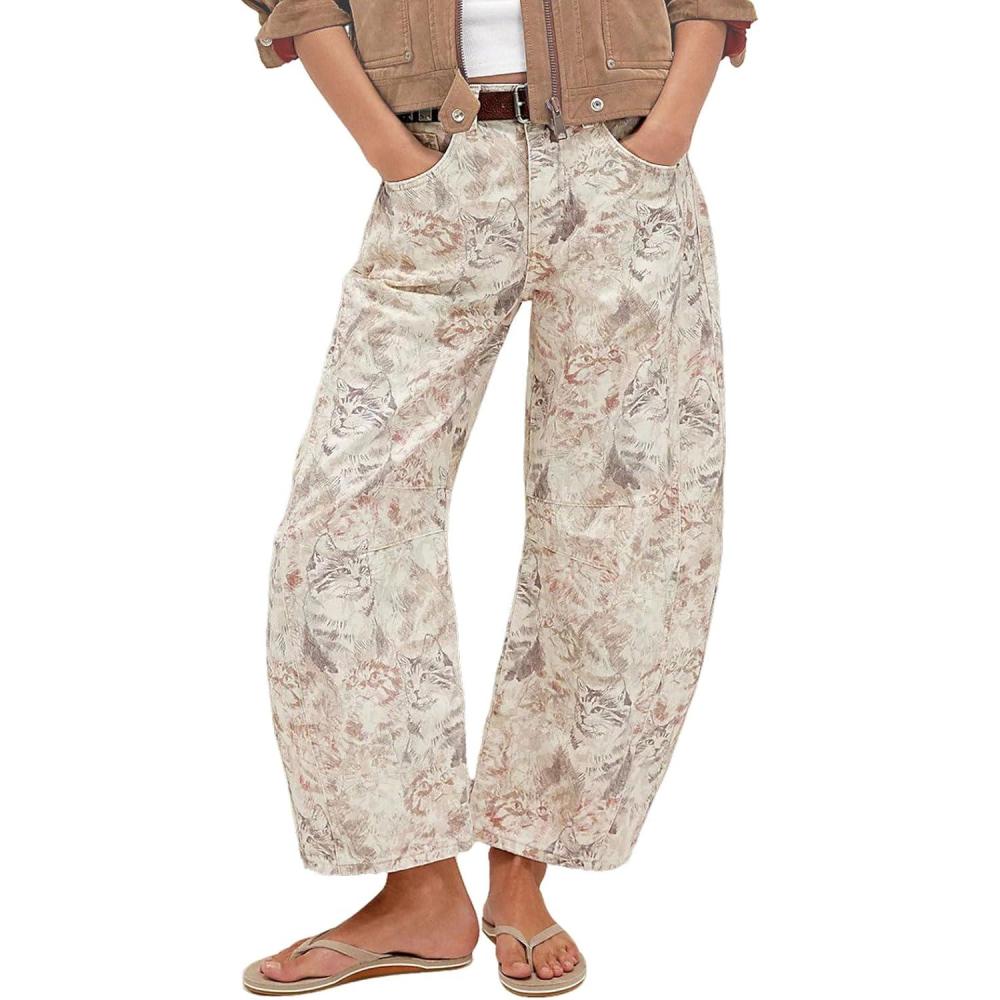 CHARTOU Womens Wide Leg Cropped Jeans Pants Baggy High Rise Denim Pants Y2k Floral Barrel Jeans(Cat Print)