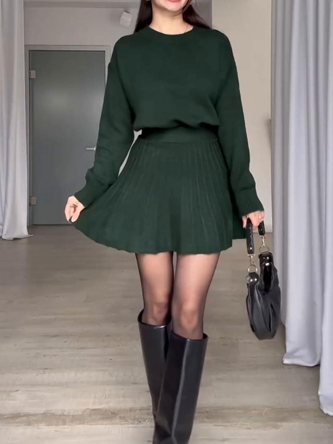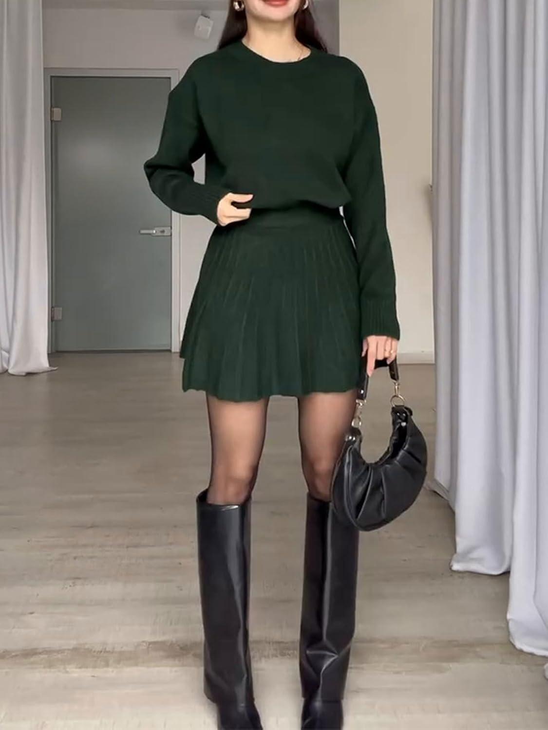 Women Dressy Pleated Skirt Sets 2 Pieces Outfits Fall Knit Sweater High Waist Ruffle Mini Skirt Sets(Green)